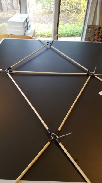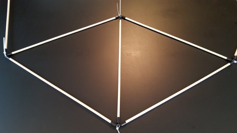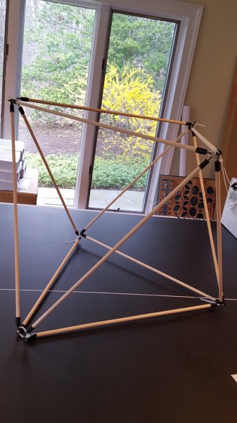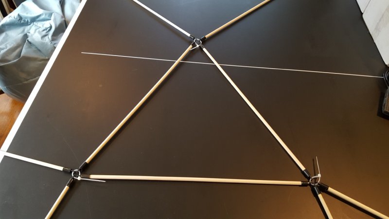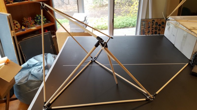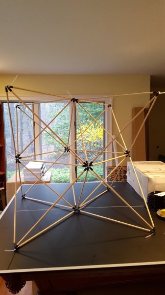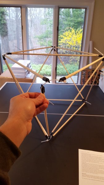 8. Repeat steps 6 and 7 for each of the other seven faces of the octahedron you completed in step 5. Note that in all, you will be adding four new ZipStix at each corner of the octahedron, so it can be more efficient to add all four at once, as long as you don’t get confused about how to connect them all up. Also note that for the optimal routing of all of the ZipStix, the four new ones at each corner should ideally alternate with the original four at that corner from the octahedron.