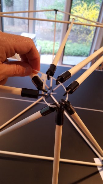 6. Now choose one triangular face, and successively open the ziptie at each vertex and add one new ZipStick and close the ziptie back up.
