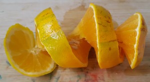 You can make the spacing between turns of the spiral wide, as shown, or narrower — whatever strikes your fancy. Keep turning until the knife comes out the other end of the orange. Then pull out the skewer and stretch the fruit out lengthwise, and voilà, you have a helicious orange.