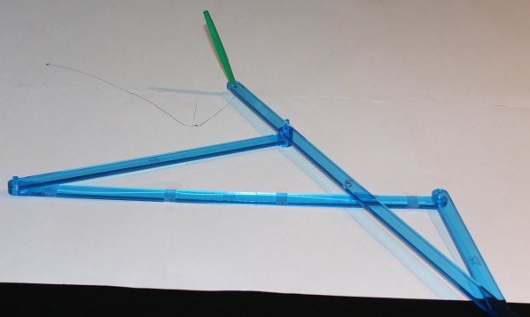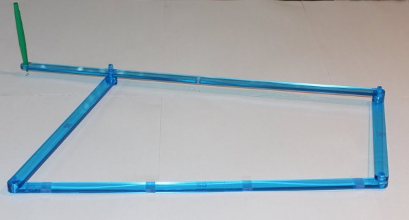 If we’re really going to understand linkages, what makes them tick, we should start from the very simplest. And one important way of measuring the complexity of a linkage is its number of “degrees of freedom”. This is basically the number of independent measurements you have to take of it at any given time to pin down exactly where every component is. You can also think of it as the number of “dimensions” in which the mechanism as a whole is able to move. For example, with the scissors jack as we used it last time, you could move the “input” pen up/down and left/right on the page, and that would determine exactly where every other component of the linkage had to be. (That’s why there was a cohesive, reproducible “output” drawing.) So that scissors jack had two degrees of freedom. Adding bars tends to increase the number of degrees of freedom; adding links tends to decrease it. (In fact, there’s a formula quantifying these phenomena, called the mobility formula.)