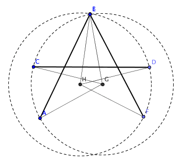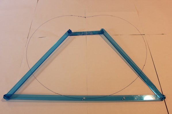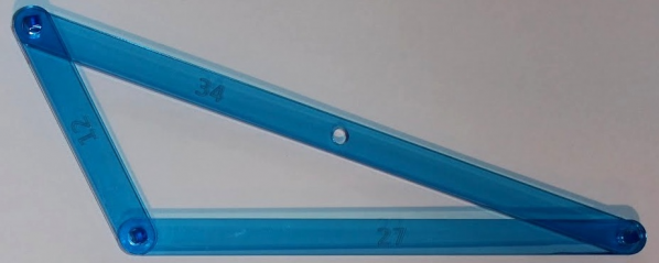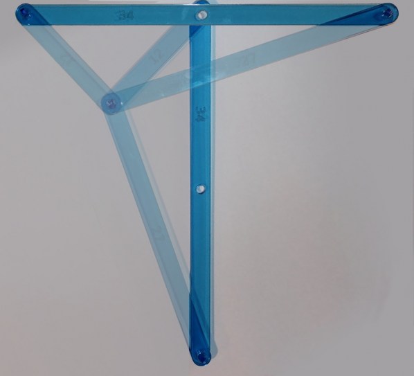 Your linkage should look like this:How to use: fix the A-C junction at a point so it is free to rotate. Position the linkage so that the 34-bar is perfectly horizontal. Now rotate it 90 degrees to the right. The top end of the 34 bar is now exactly at the midpoint of its former location, i.e. the two positions of the 34 make a letter “T”. The bar lengths were computed, using the construction above, to arrange that letter T. Here are the two positions of the linkage, superimposed with the GIMP:OK, if we only used three of the four bars to achieve two positions, we clearly have capability to spare. Can we achieve any three arbitrary positions for one of the bars, which we will call the “floating bar”? For example, could we make the floating bar successively take the positions of the three strokes of a letter A? Indeed, we can. The key in this case is to recognize that with one fixed bar, the free endpoints of each of the other two bars which are linked to the fixed bar must travel in a circle (that’s the “siamese compass” mentioned last time). Therefore, we need to find one circle that goes through the three corresponding positions of one of the endpoints of the floating bar, and another circle that goes through the three positions of the other endpoint of the floating bar. Since there is a circle (or technically, sometimes a straight line) through any three points, we can always do this, as the following diagram and Geogebra worksheet show:And here is the diagram with the segments moved to mimic the the three strokes of an “A” (note that points B and E are now superimposed):This leads to our next recipe: