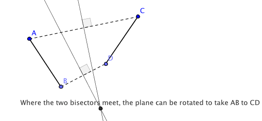 It turns out that if we just specify two locations for a bar, there is always a simple rotation of the plane which maps the one location to the other, as this diagram (and Geogebra worksheet) show. (Technical note: it might happen that it’s actually a pure translation that moves the bar from one position to the other. But that can be thought of as a rotation about a point “infinitely far away”, so it’s not really that much of an exception.)Translating this to our four-bar linkage, we can connect that point of rotation to the two ends of the moving bar, and the fourth, fixed bar of the linkage shrinks down just to a fixed point. We apply this result to the upright and the crossbar of a large letter “T” in the next recipe: