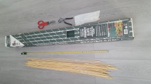 The snub disphenoid example we’re making has 18 edges, so on the right I’ve counted out 20 cut privacy slats and 40 dowels — a couple of extra in case anything goes wrong.