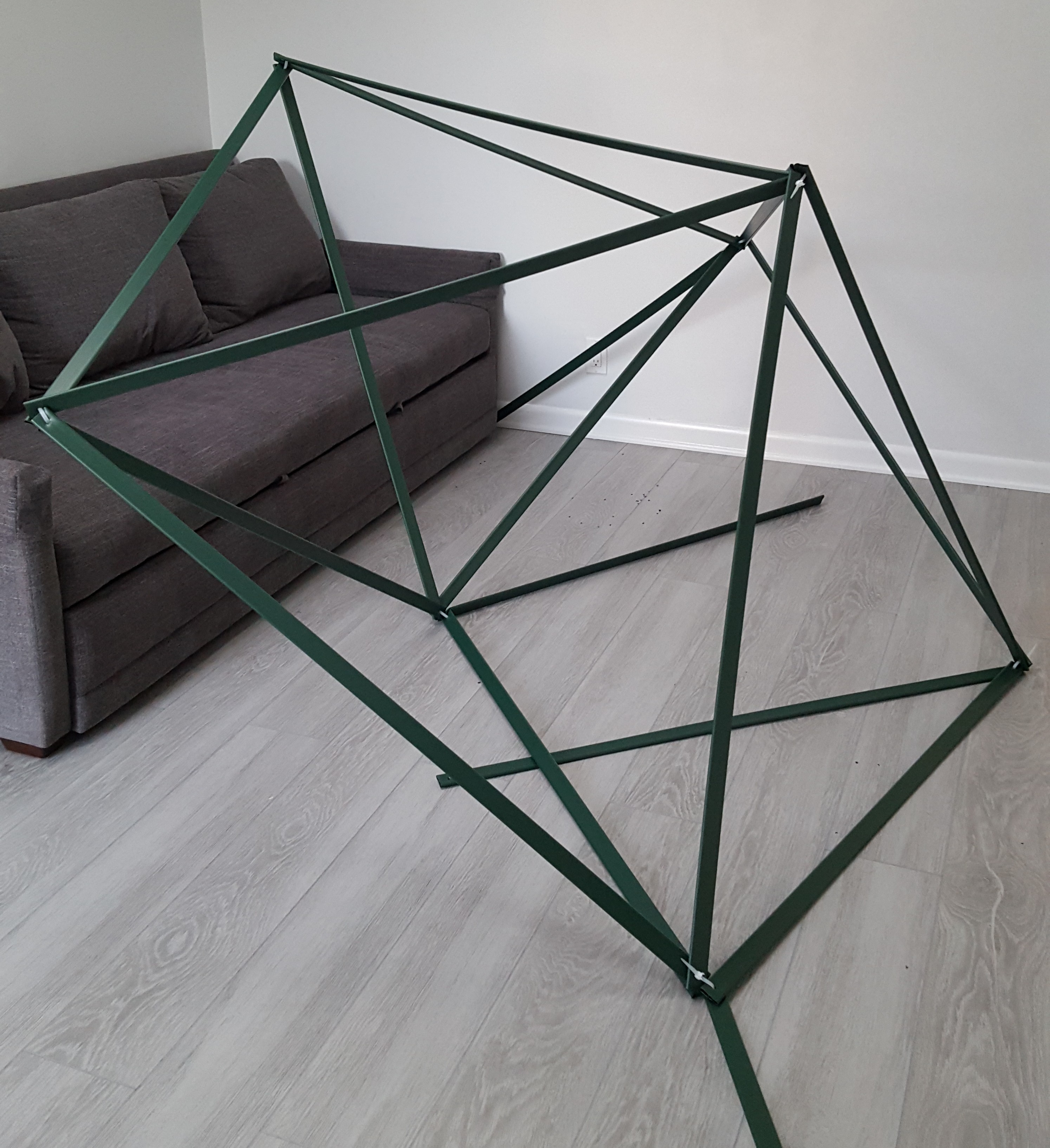 You will find that by disconnecting just two vertices (be sure to mark the ends at each junction you disconnect for easy reassembly) you can fold the whole polyhedron flat for easy transport, and…
